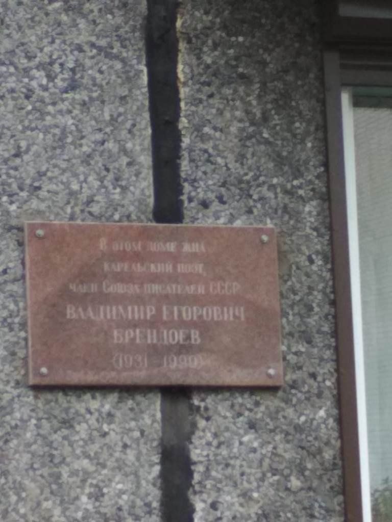 В городе Олонце установлена мемориальная доска его памяти, одна из улиц города носит имя В. Е. Брендоева. Олонецкая национальная библиотека носит имя писателя. В Олонце проходит традиционный фестиваль поэзии, посвященный памяти В. Брендоева.