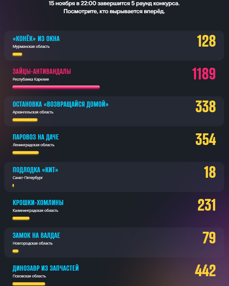 Наши зайцы соревнуются за народные симпатии с арт-объектом «Конёк» из окна» (Мурманская область), Остановкой «Возвращайся домой» (Архангельская область), «Паровозом на даче» (Ленинградская область), «Крошками-хомлинами» (Калининградская область), «Динозавром из запчастей» (Псковская область), «Подлодкой «Кит» (Санкт-Петербург) и «Замком на Валдае» (Новгородская область). На сайте проекта есть фото каждого участника, его описание и история создания.