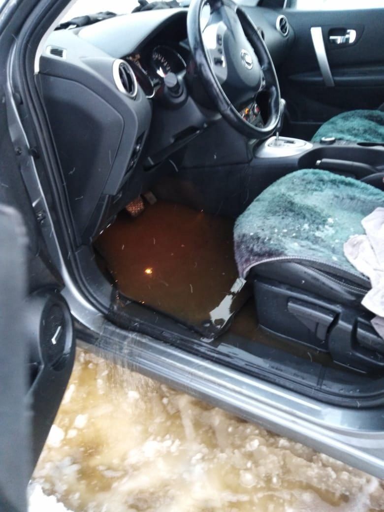 Дорога к горе – не самая комфортная и в теплое время года, а в начале зимы здесь с трудом проедет даже спецтехника. Беспечность южан привела к ЧП – автомобиль «Ниссан» провалился в огромную ледяную лужу. Вода хлынула в салон. Фотографии затопленной машины опубликовал паблик «Гора Воттоваара Муезерского района».
