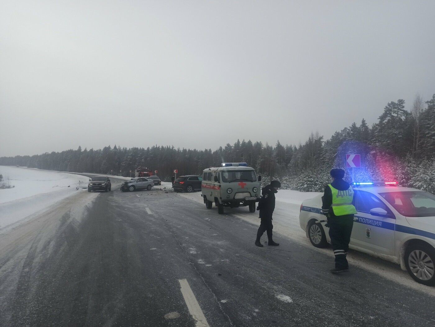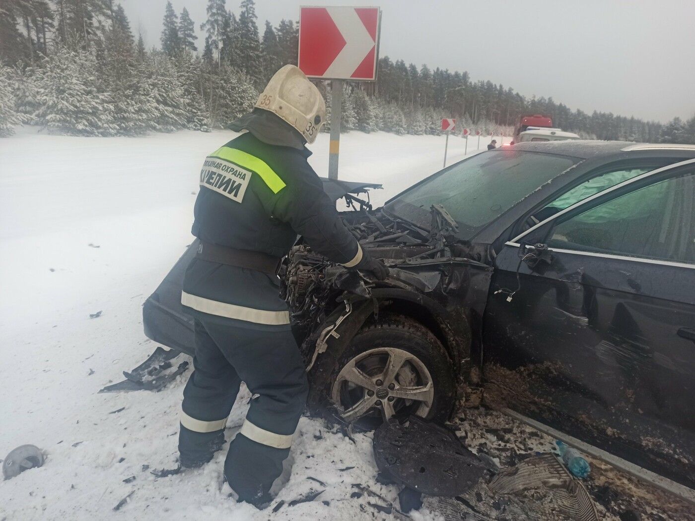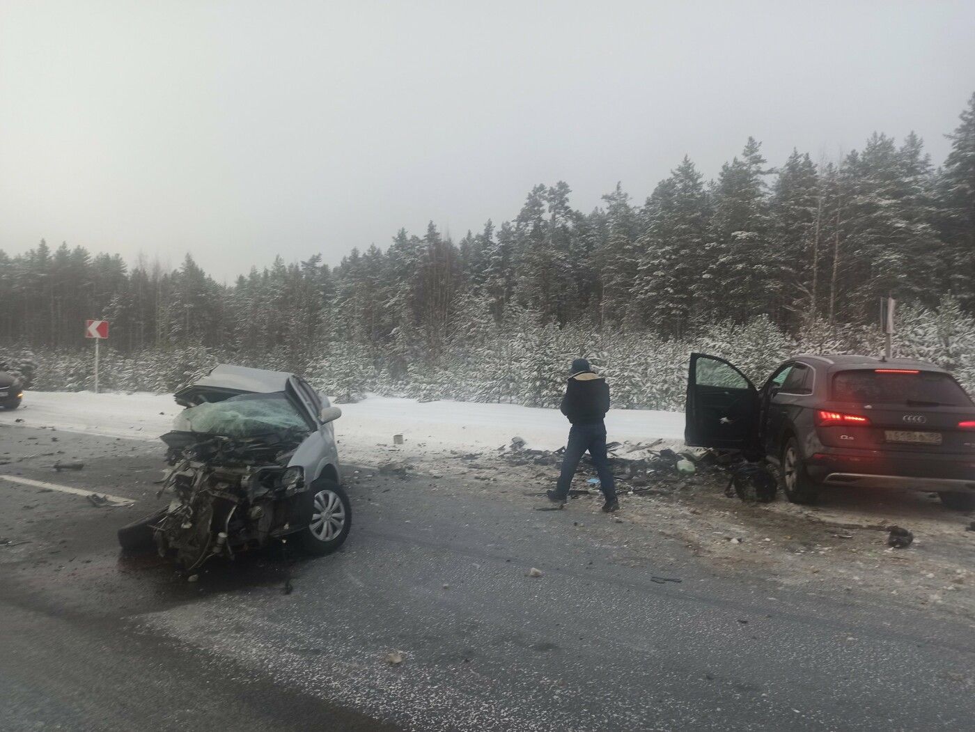 Машина двигалась в сторону Петербурга. Во встречном направлении ехал «Ауди-Q5». «Ниссан» вылетел на встречку и врезался в «Ауди». От лобового столкновения оба транспортных средства получили сильные повреждения.