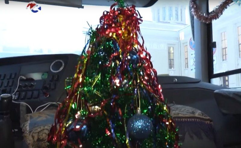 Водитель рейсового автобуса украсил салон транспортного средства новогодней атрибутикой.