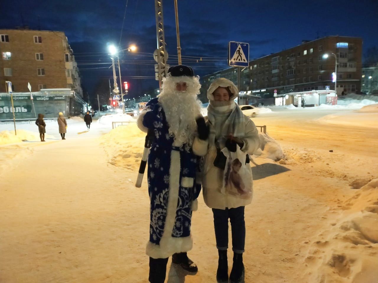 Жителей карельской столицы с наступающими праздниками поздравил полицейский Дед Мороз. Сотрудник ГИБДД в наряде сказочного волшебника рассказывал о правилах безопасности на дороге. Помогали «Дедушки» ребята из школы № 29.