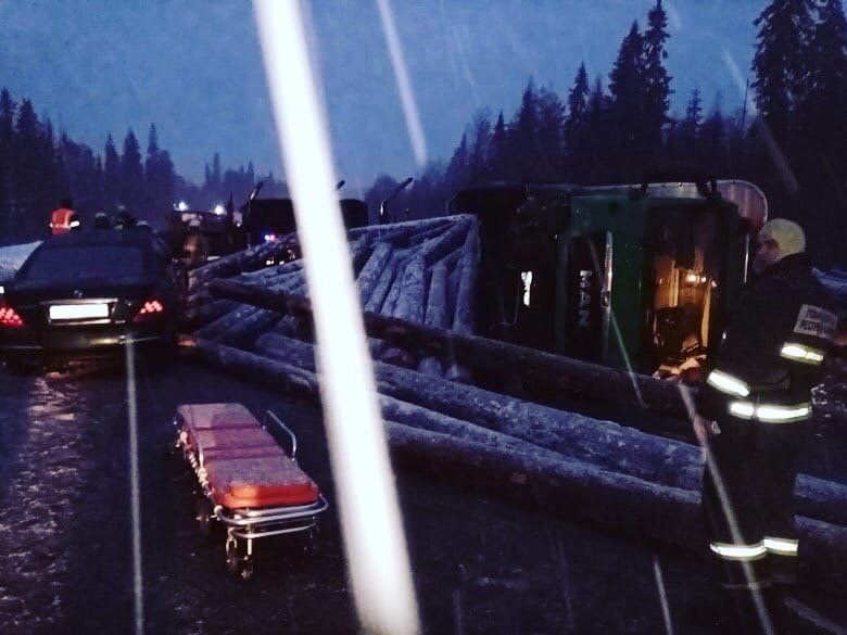 На 341 километре автодороги Р-21 «Кола» занесло лесовоз, после транспортное средство опрокинулось. бревна рассыпались по дороге. Два легковых автомобиля врезались в это препятствие. Один человек получил травму.