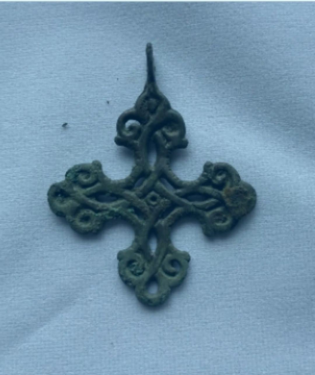 В погребении найдены меч, шпоры, серебряные монеты и редкий бронзовый наперсный крест. Предметы указывают на высокий социальный статус владельца и его принадлежность к военной элите. Крест аналогичен артефактам с острова Готланд, что свидетельствует о активных торговых и культурных обменах.