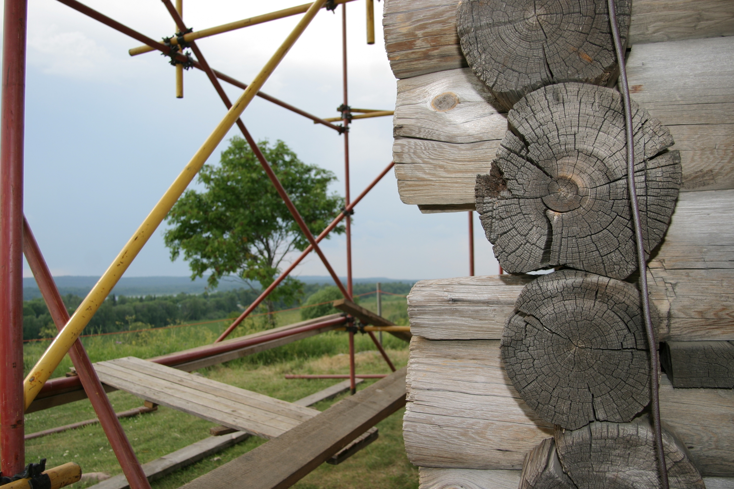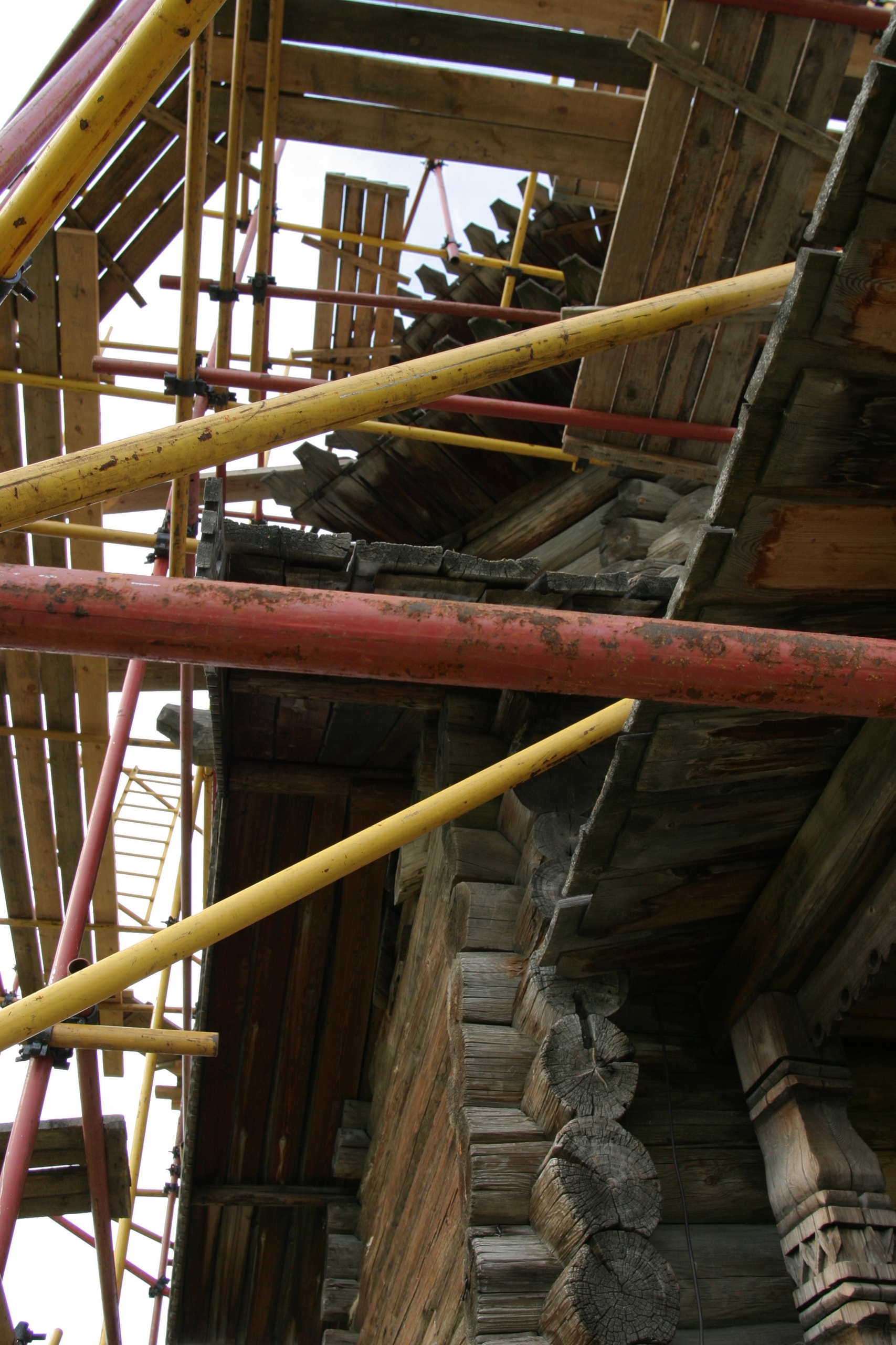 На кадрах запечатлена Преображенская церковь в период подготовки к уникальной реставрации с разборкой по технологическим поясам. Храм тогда стоял с незашитым верхним восьмериком. Автор напомнил о принципах зодчества Витрувия: пользе, прочности и красоте.