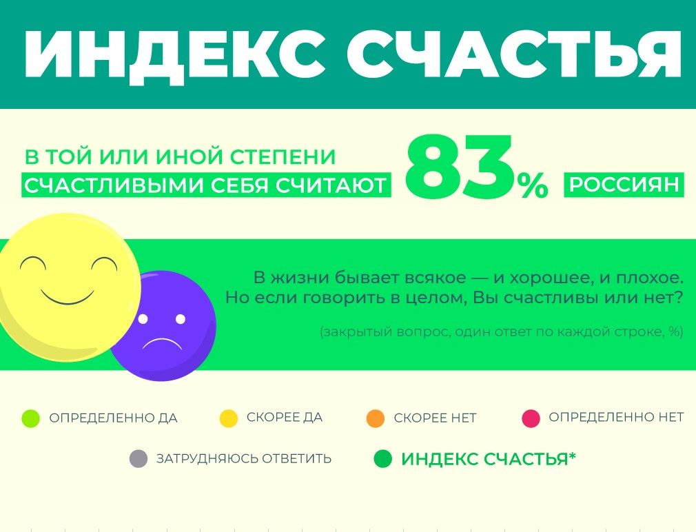 Индекс счастья, уточняют во ВЦИОМ, показывает, насколько счастливыми чувствуют себя россияне. Он строится на основе вопроса: «В жизни бывает всякое и хорошее, и плохое. Но, если говорить в целом, вы счастливы или нет?».