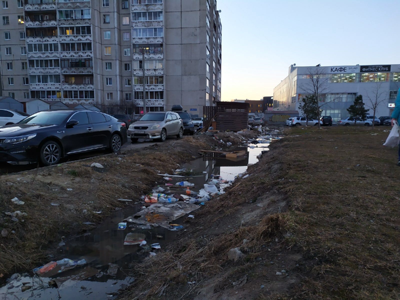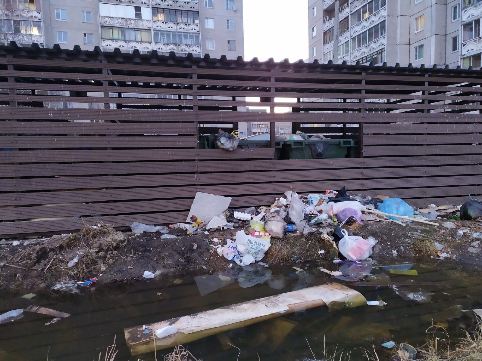 Видно, что панели выломаны и мусор разлетается по округе. Плотный ковер укутал сточную канаву и прилегающие к ней территории. Настоящее раздолье для крыс и птиц.
