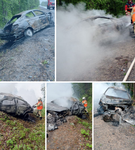 По информации ведомства, пострадавших двое — их транспортировали в машину скорой помощи и доставили в Костомукшскую ЦРБ. Горящий автомобиль тушили с помощью одной автоцистерны, затем проливали место ДТП. Судя по кадрам, автомобиль получил сильные механические повреждения. Произошел розлив топлива.