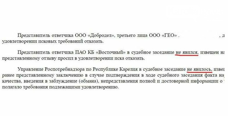 Ну и так далее по сценарию. Решение суд вынес в августе. Женщина не смогла вернуть средства, так как не смогла доказать, что ее заставили совершить невыгодную для себя сделку. Представители Управления Роспотребнадзора Карелии, которых суд вызывал, на заседание не явились. А ведь именно там работает отдел по защите прав потребителей. Не явились и вызванные судом представители банка «Восточный».