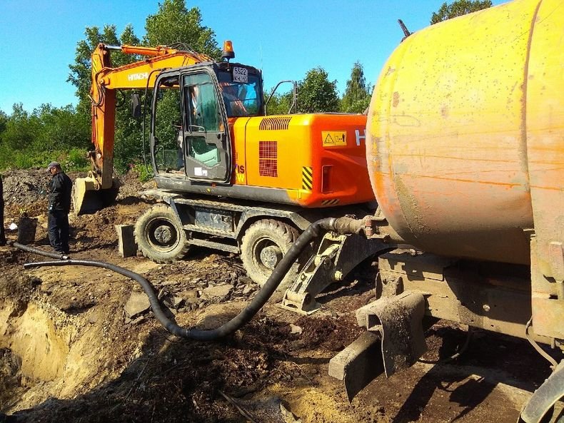 Сейчас на площадке работают экскаватор, кран и специализированный автомобиль для откачки остатков нефтесодержащей воды. Цистерну сегодня должны извлечь из земли. Также запланировано извлечение примерно пяти кубометров грунта с места вокруг емкости – он частично загрязнен нефтепродуктами, — рассказал заместитель директора МКУ «Служба заказчика» Андрей Рогалевич.