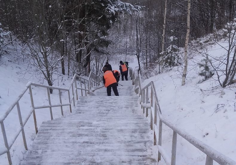 Общественные территории от снега очищает Городской комбинат благоустройства. Его работники подсыпают лестничные спуски и детские площадки, дорожки в парках и скверах.