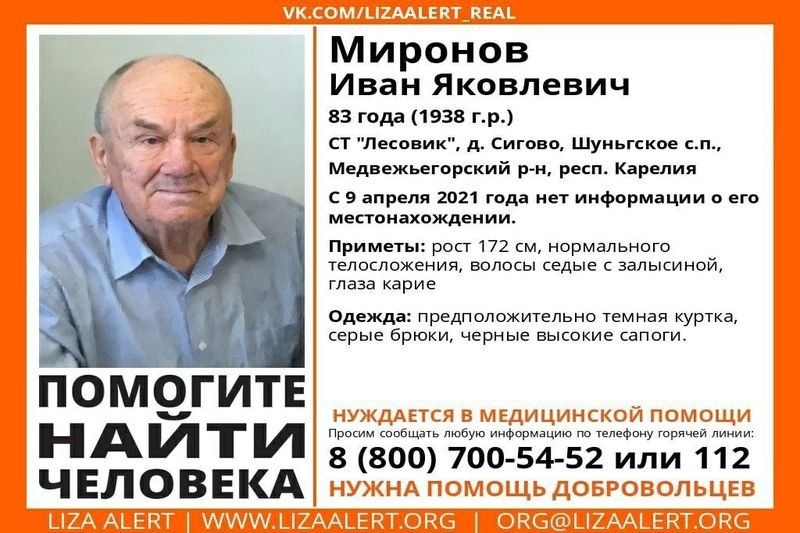 Скорее всего мужчина нуждается в медицинской помощи. Как сообщили на странице ПСО «Доброспас», Иван Яковлевич был одет в темную куртку, высокие чёрные сапоги из ПВХ, серые брюки и вязаную спортивную шапку. Его рост — примерно 170-172, нормального телосложения, плохо слышит.
